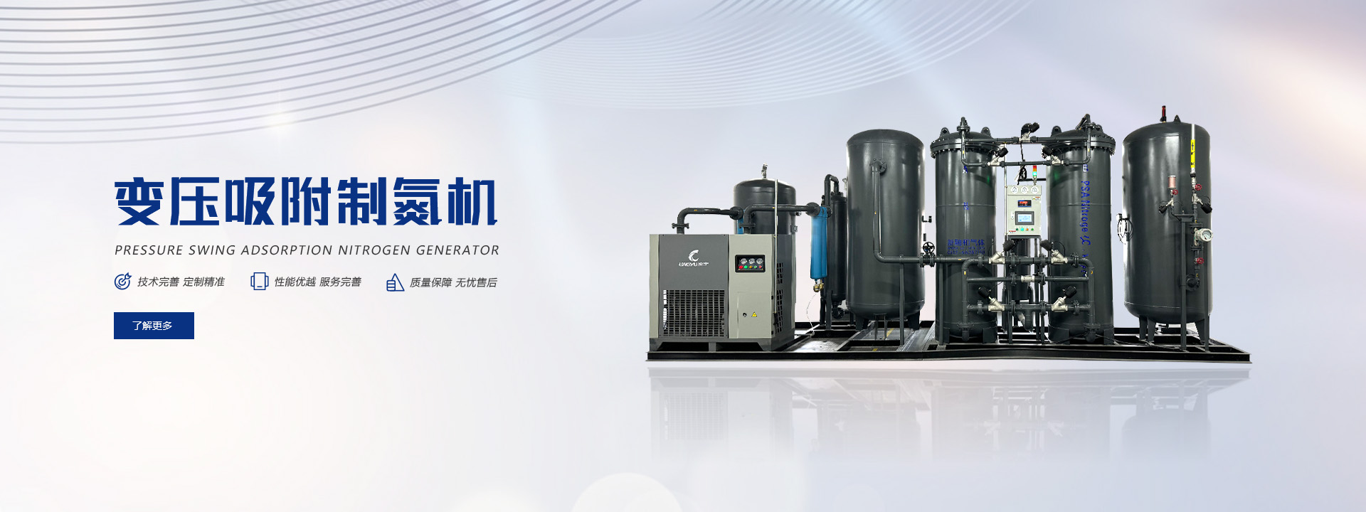 碳分子篩變壓吸附(Pressure Swing Adsorption,簡稱PSA)制氮裝置,是一種新型的空氣分離的高新技術(shù)設(shè)備,以壓縮空氣為原料,碳分子篩為吸附劑,采用變壓吸附流程制取氮氣。